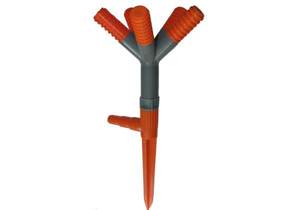 Вращающийся дождеватель с четырьмя регулируемыми "лопастями". Устанавливается на пластиковой основе типа "колышек".