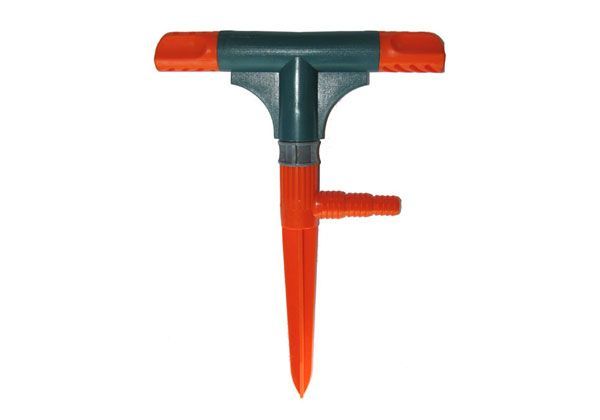 Вращающийся дождеватель с двумя регулируемыми "лопастями". Устанавливается на пластиковой основе типа "колышек".