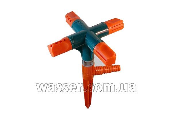 Вращающийся дождеватель с четырьмя регулируемыми "лопастями". Устанавливается на пластиковой основе типа "колышек".