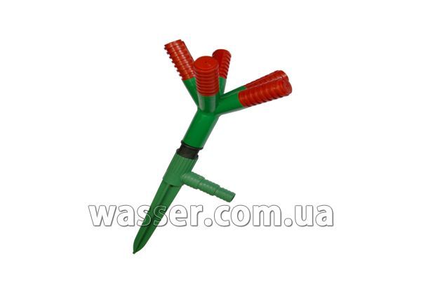 Вращающийся дождеватель с четырьмя регулируемыми "лопастями". Устанавливается на пластиковой основе типа "колышек".